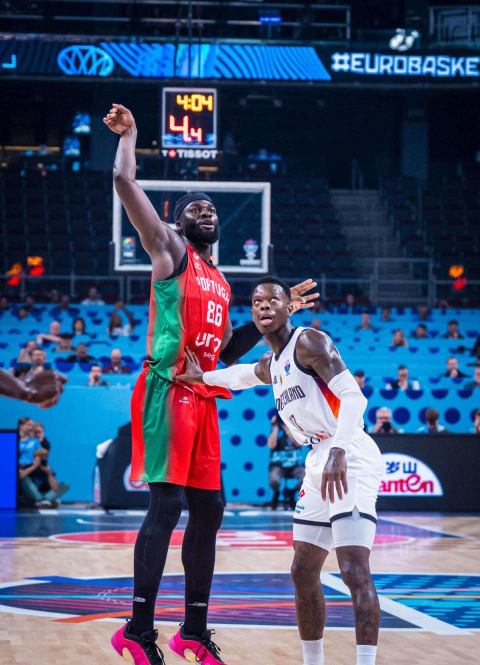 进入第四节比赛,施罗德上篮与两罚一中,罗接连命中两记三分,奥布斯特大号两分命中打停对手。泰斯暴扣,德国男篮已经打出13-0攻势,扩大65-51领先14分优势,威廉姆斯三分打破葡萄牙男篮得分荒。泰斯补篮得分,罗与特里斯坦-席尔瓦各中一记三分,邦加两罚一中扩大74-54领先优势。比赛已经提前失去胜负悬念,德国男篮借助末节攻防压制打崩对手,最终德国男篮大胜葡萄牙男篮晋级八强。